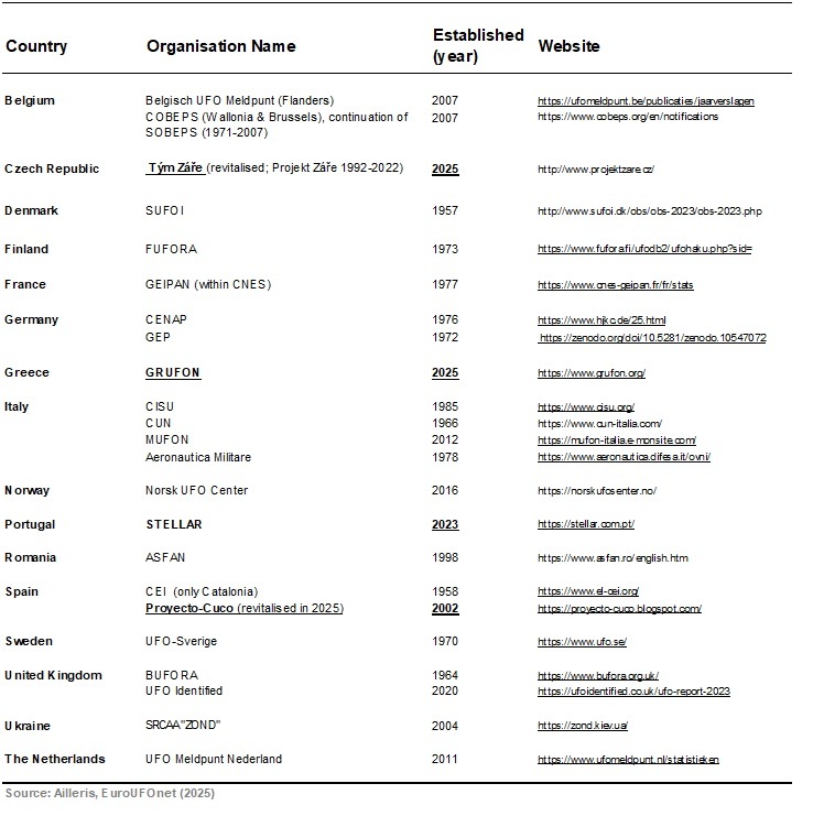 Erstens die Integration von fünf zusätzlichen europäischen Ländern, für die verlässliche nationale Angaben durch die Gründung, Reaktivierung oder Fortführung lokaler Organisationen gewonnen werden konnten. In der Tschechischen Republik wurde das frühere Projekt Záře unter dem neuen Namen Tým Záře erfolgreich wiederbelebt und damit eine nach 2020 ins Stocken geratene nationale Datenerfassung wieder aufgenommen. In Griechenland markiert die Gründung von GRUFON (Greek UFO Network) im September 2025 den ersten ernsthaften Versuch seit Jahrzehnten, einen dauerhaften nationalen Rahmen für die Meldung und Analyse von UAP zu etablieren. Auch Spanien verzeichnet wichtige Fortschritte durch die Einbeziehung von Project CUCO (gegründet 2002), womit die systematische Datenerfassung erstmals über die langjährige, jedoch geografisch auf Katalonien beschränkte Tätigkeit des CEI (Centre d’Estudis Interplanetaris) hinaus ausgeweitet wird. In Portugal wurde mit der Gründung von STELLAR im Jahr 2023 eine nationale Struktur zur systematischen Sammlung von UAP‑Berichten wieder eingeführt und damit eine langjährige Lücke auf der Iberischen Halbinsel geschlossen. Schließlich konnte auch die Ukraine trotz außergewöhnlicher Umstände aktualisierte, wenn auch notwendigerweise partielle Daten über ZOND beisteuern, eine Organisation unter dem Dach der Aerospace Society of Ukraine. ZOND setzt eine wissenschaftliche Tradition fort, die Anfang der 1980er‑Jahre unter der Nationalen Akademie der Wissenschaften begründet wurde, und untersucht anomale Phänomene kontinuierlich seit 2004 – auch während des anhaltenden Krieges.