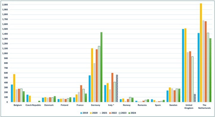Hinweis: Die Daten für 2024 sind für Italien und das Vereinigte Königreich unvollständig; die Gesamtsumme ist daher unterschätzt.