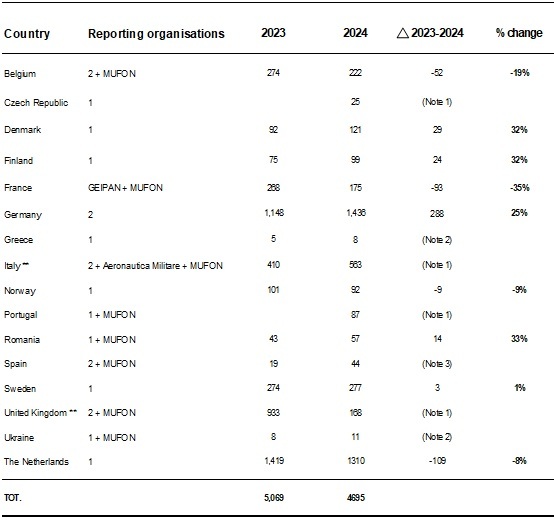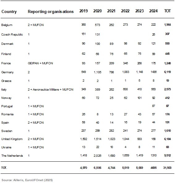 Die Tabellen und Diagramme in diesem Abschnitt fassen die Rohdaten zu UFO-/IFO-Sichtungen zusammen, die 23 Organisationen in 16 europäischen Ländern gemeldet wurden, für die konsolidierte nationale Statistiken vorliegen. Die Daten für das Vereinigte Königreich für das Jahr 2024 fehlen derzeit noch, werden aber voraussichtlich im nächsten Jahr veröffentlicht. Auch die Informationen einer großen italienischen Vereinigung liegen noch nicht vor. Diese Länder haben ein wichtiges strukturelles Merkmal gemeinsam: Es gibt dort ansässige zivile UAP-Vereinigungen oder offizielle Stellen, die über mehrere Jahre hinweg kontinuierlich und langfristig Daten gesammelt und stabile Kontakte zu EuroUfo.Net unterhalten haben (Tabelle 2).
