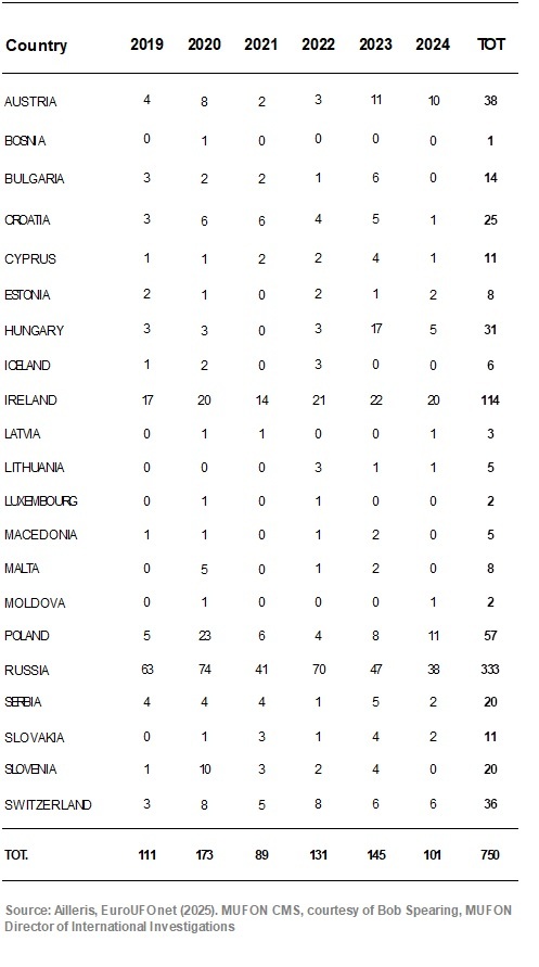 Tabelle 6: MUFON CMS-Berichte über UAP in europäischen Ländern ohne nationale Meldeorganisationen (2019–2024)