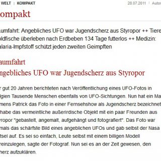 Im Zuge der Ereignisse um den mutmaßlichen Petit-Rechain-Schwindel haben die Medien das Sommerlochthema „UFOs“ wieder dankbar aufgegriffen. Den in Internet und Druckmedien veröffentlichten Artikeln ist meist jedoch nichts Neues zu entnehmen, oft wurden ganze Satzbausteine einfach 1:1 von anderen Medien übernommen. So ist die Meldung von der Fälschung eines der bekanntesten UFO-Fotos auch Welt.de ein paar kurze Zeilen in der...
