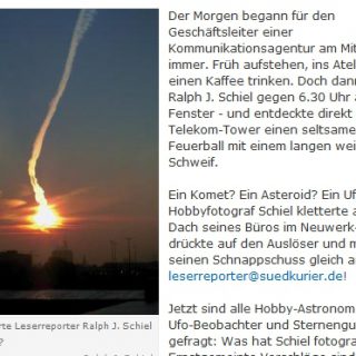 Was war das? Der SÜDKURIER fragt seine Leser nach ihren Ideen zu einem UFO-Foto. Demnach hatte ein so genannter Leserreporter gestern morgen ein „mysteriöses Flugobjekt“ gesehen und fotografiert. Christian Czech, Administrator der UFO-Datenbank und Vorstandsbeisitzer der GEP, hat hier recherchiert und der Redaktion seine ernst gemeinte Antwort zukommen lassen. Leserreporter fotografiert „Ufo“ über dem Telekom-Tower Mittwochmorgen. Ralph J. Schiel trinkt...